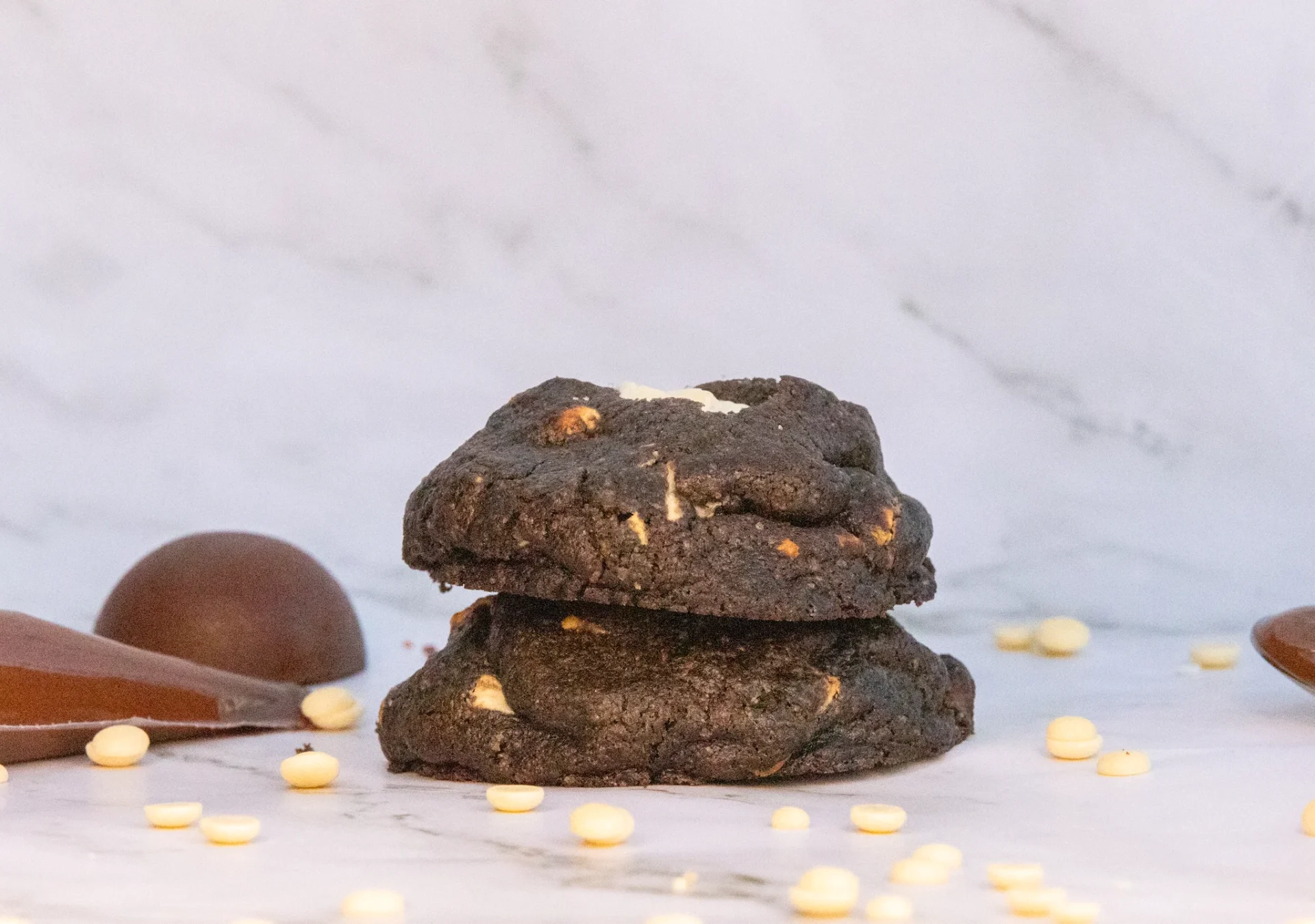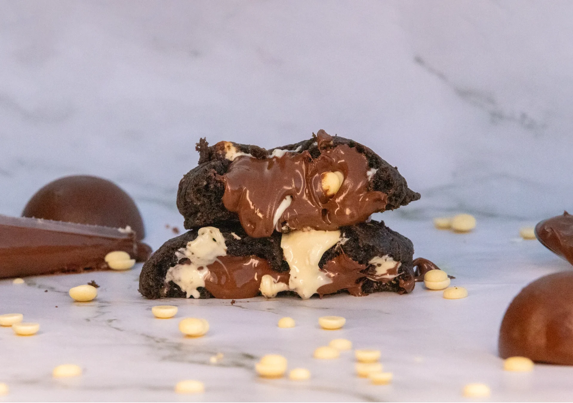 Une pâte intense au cacao noir, dévoilant un cœur fondant au Nutella, enveloppé de généreux éclats de chocolat blanc. Fondant, décadent, addictif.