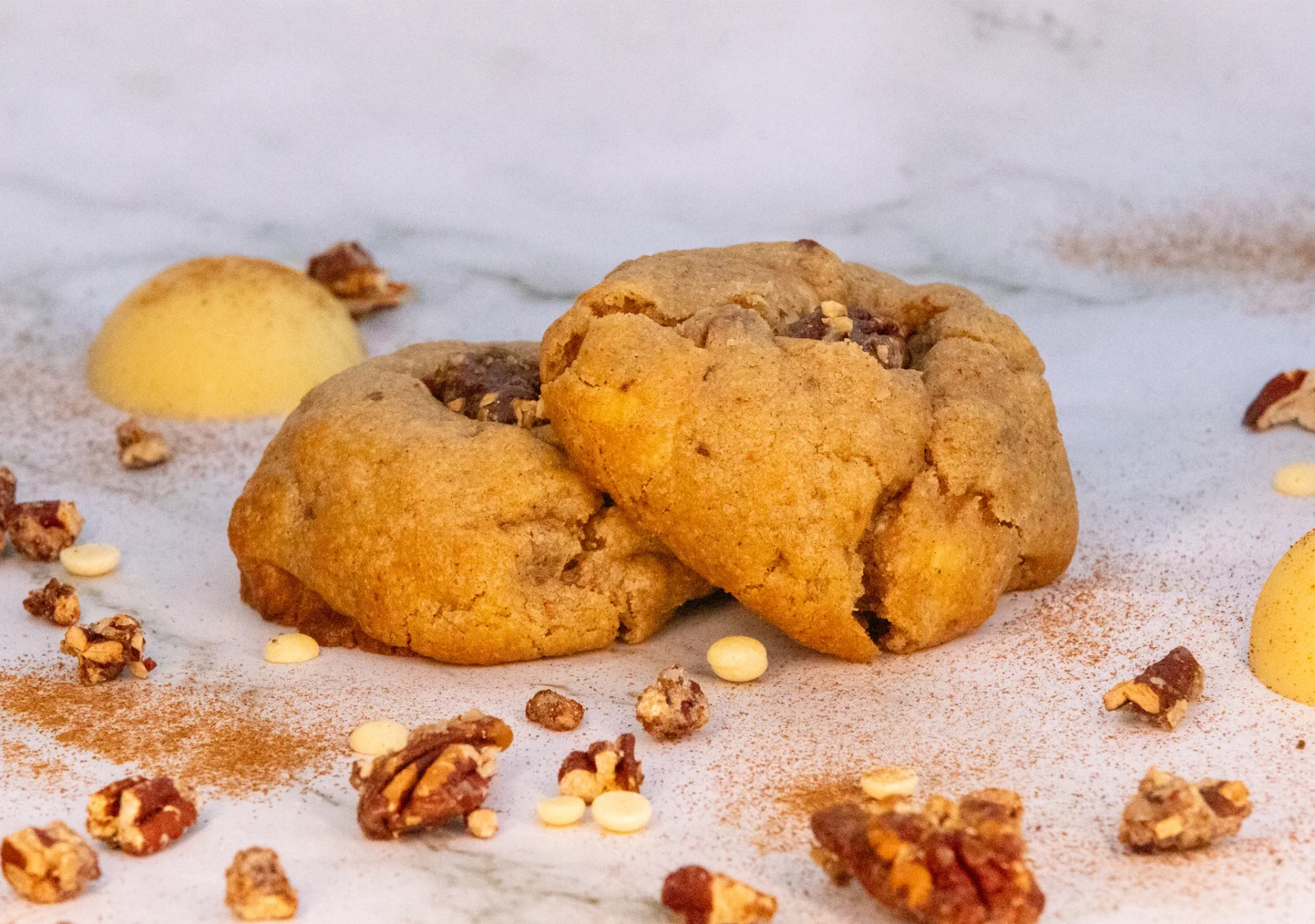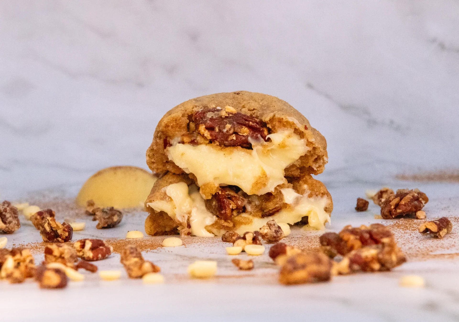 Une pâte parfumée aux épices d’automne, parsemée de chocolat blanc d’exception et de noix de pécan craquantes. Au centre, notre crème cheesecake douce et onctueuse. Chaleureux, réconfortant, unique.